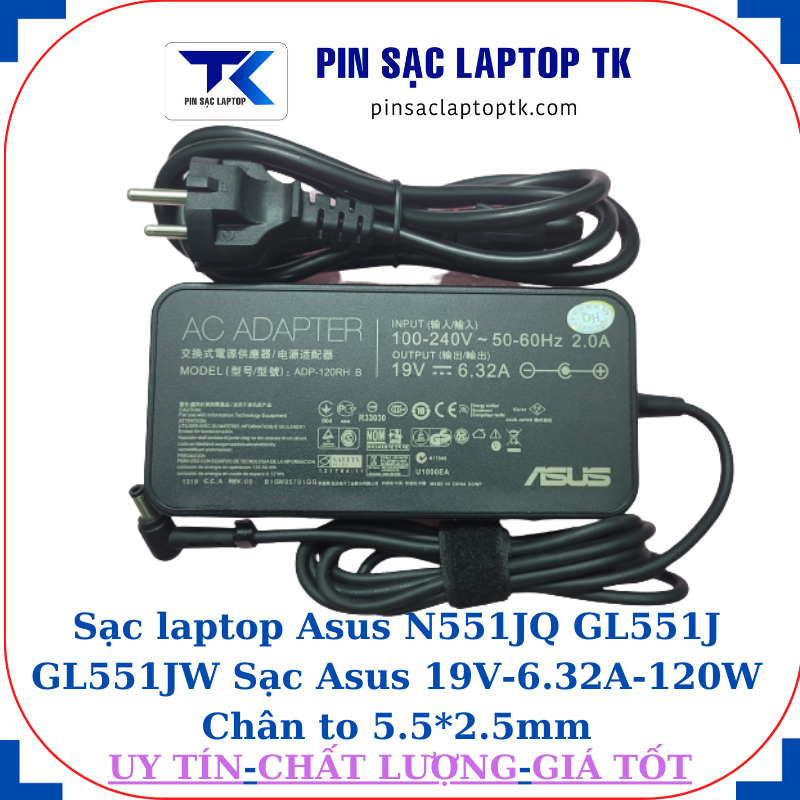 * Shop cam kết sản phẩm Sạc laptop Asus N551JQ GL551J GL551JW Sạc Asus 19V-6.32A-120W Chân to 5.5*2.5mm: